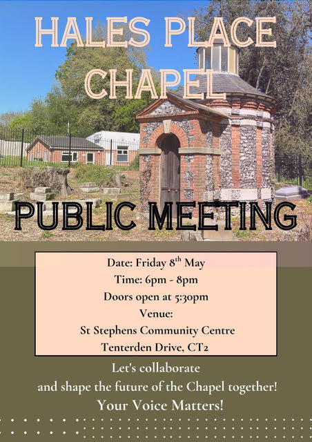 Pauline Walters from CHAS (Canterbury Historical & Archaeological Society) would like to invite you to a public meeting about the future of Hales Place Chapel, Tenterden Drive, Canterbury, Kent.