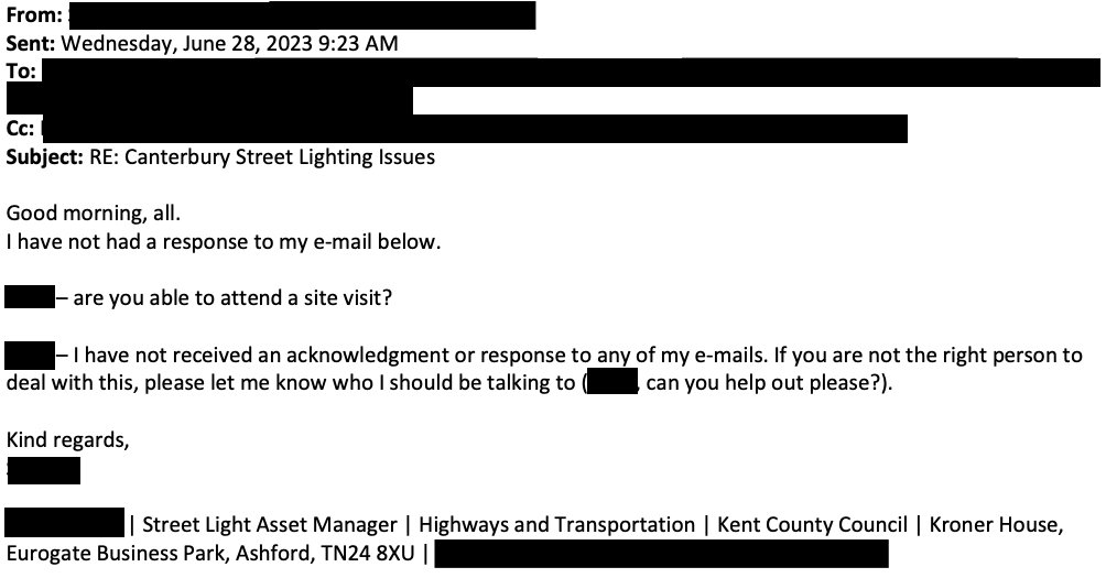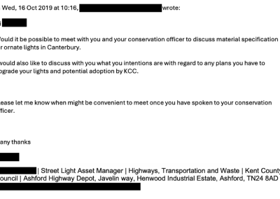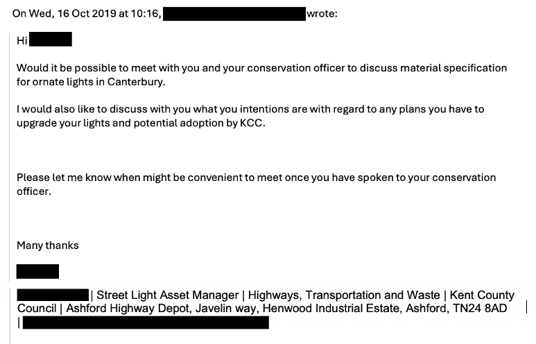 However, emails released under freedom-of-information rules tell a more complicated story. They show that for at least four years, Kent County Council officers repeatedly asked Canterbury City Council for guidance on how failed historic lampposts should be handled. Those requests included site visits, design discussions and proposals for Canterbury-specific replacements.